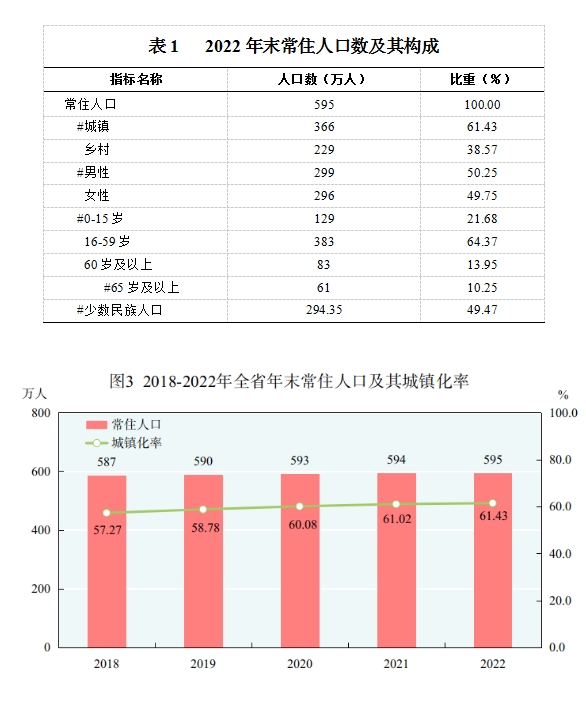 年末常住人口595万人,比上年末增加1万人。其中少数民族人口294.35万人,占常住人口的比重为49.47%。按城乡分,城镇人口366万人,增加3.5万人;乡村人口229万人,减少2.5万人;城镇人口占常住人口比重(常住人口城镇化率)为61.43%,比上年末提高0.41个百分点。全年人口出生率为10.60‰,比上年下降0.62个千分点;人口死亡率为7.23‰,上升0.32个千分点;人口自然增长率为3.37‰,下降0.94个千分点。