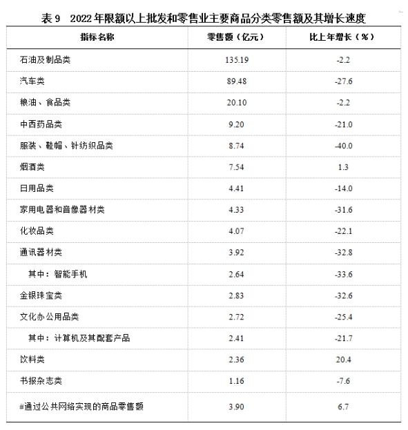 全年社会消费品零售总额842.08亿元,比上年下降11.2%。按规模分,限额以上企业(单位)[17]零售额309.51亿元,下降16.3%;限额以下单位(个体户)零售额532.57亿元,下降7.9%。按经营地分,城镇消费品零售额685.53亿元,下降11.2%;乡村消费品零售额156.55亿元,下降11.0%。按消费类型分,商品零售775.85亿元,下降10.8%;餐饮收入66.23亿元,下降15.1%。