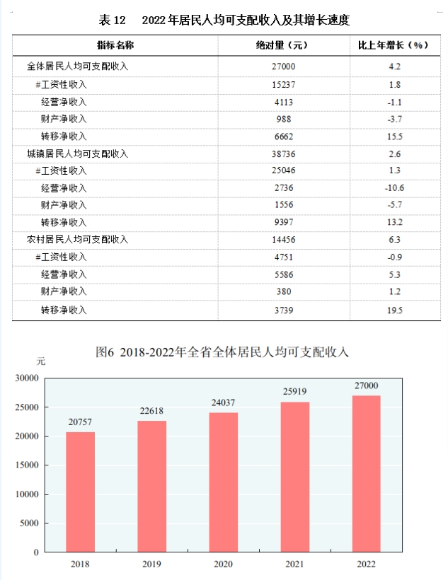 全年全体居民人均可支配收入27000元,比上年增长4.2%。城镇居民人均可支配收入38736元,增长2.6%;农村居民人均可支配收入14456元,增长6.3%。城乡居民人均收入比(以农村居民人均收入为1)为2.68,比上年缩小0.09。