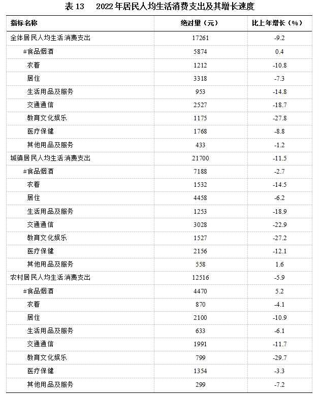 全年全体居民人均生活消费支出17261元,比上年下降9.2%。城镇居民人均生活消费支出21700元,下降11.5%;农村居民人均生活消费支出12516元,下降5.9%。居民恩格尔系数为34.0%,其中城镇为33.1%,农村为35.7%。