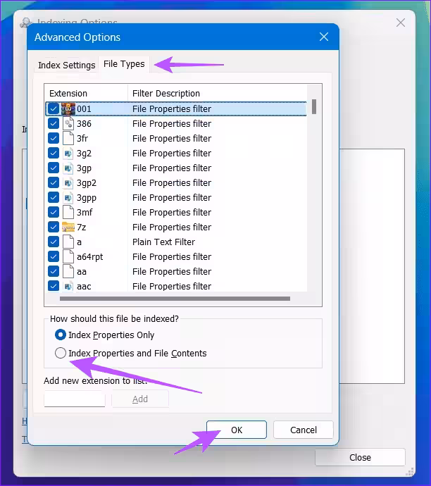 步骤3:打开文件类型选项卡,选择索引属性和文件内容,然后单击 ok ok 。这将重建Windows搜索索引,以解决搜索问题。