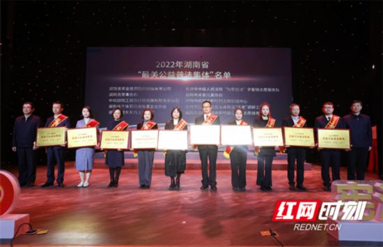 省委依法治省办副主任、省司法厅党组书记、厅长范运田,省人大常委会委员、监察和司法委员会主任龙朝阳为“2022年湖南省最美公益普法集体”颁奖。单位供图