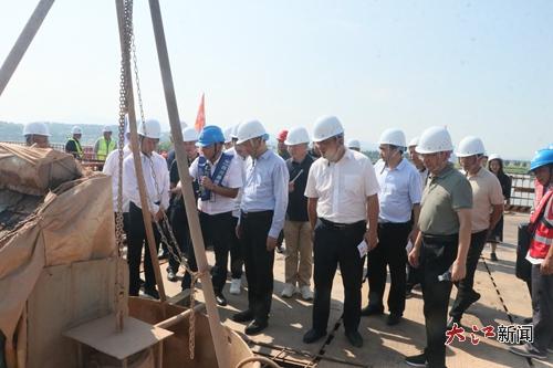 大江网/大江新闻客户端讯 记者曾庆扬报道:烈日当空,赣江之滨机械轰鸣、焊花飞溅,两座跨江大桥的建设现场一派繁忙景象。7月4日,吉水县组织开展“两桥”项目建设开放日暨调度会,县领导、老干部代表、人大代表、政协委员、基层干群及省市媒体代表等70余人,深入S221吉水赣江大桥危桥重建与西沙埠赣江大桥新建工程施工现场,实地探访项目建设情况,了解项目建设的重要意义。