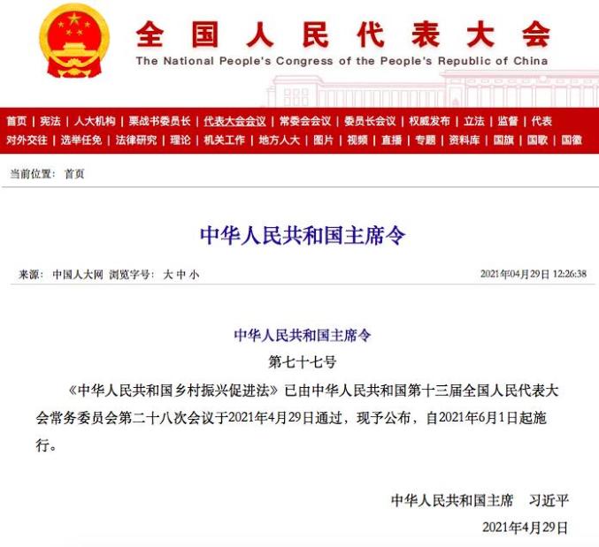 2021年4月29日,十三届全国人大常委会第二十八次会议表决通过《乡村振兴促进法》。从此,我国促进乡村振兴有法可依。这是我国三农法治建设的一件大事,也是全面推进乡村振兴、加快农业农村现代化的一件大事。