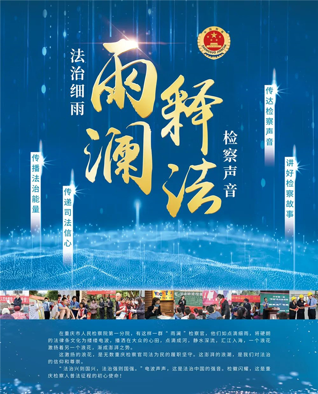 品牌内涵:“雨澜”意为细雨润物、以涟涟波澜助推法治中国建设;“释法”指以案说法讲好检察故事、传递检察声音。该品牌围绕“四大检察”“十大业务”,发掘亲历办案中的真实典型普法案例,携手权威电台媒体“重庆之声”,合作制播《雨澜释法》栏目,实现覆盖全市、在全国有影响力的传播。联动专家学者、行业代表及各部门,深入社区、学校、养老院、企业等打造普法阵地,在社会治理中贡献检察力量。