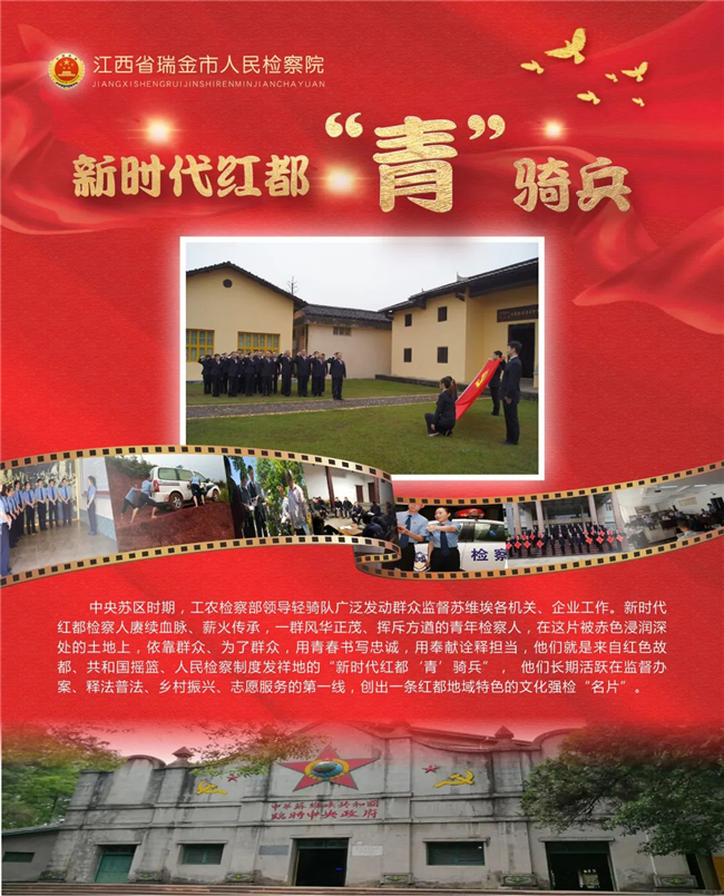 品牌内涵:江西瑞金是人民检察制度发祥地。中央苏区时期,轻骑队在工农检察部的领导下,办理了很多有影响的案件。90年后的今天,瑞金市检察院继承和弘扬苏区检察光荣传统,依托党建、团建阵地,组织青年干警组建新时代红都“青”骑兵,活跃在检察办案、普法释法、乡村振兴、矛盾化解的第一线,依靠群众、发动群众、服务群众,成为瑞金维护社会稳定、优化营商环境、推进市域社会治理的重要法治力量。