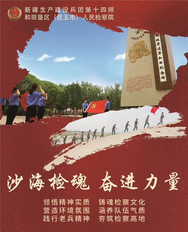 品牌内涵:被习近平总书记概括为“扎根新疆、热爱新疆、屯垦戍边”的沙海老兵精神是兵团精神的重要组成部分,是新疆生产建设兵团第十四师昆玉市特有的红色基因和文化资源。和田垦区(昆玉市)检察院检察文化建设以此为精神内核和红色灵魂,铸就了以“奉献、守正、自强”为主要内容,兼具检察特色、兵团特色、和田特色、昆玉特色的“沙海检魂”文化品牌,助推该院用短短一年时间实现了从“薄弱”到先进的跨越发展。