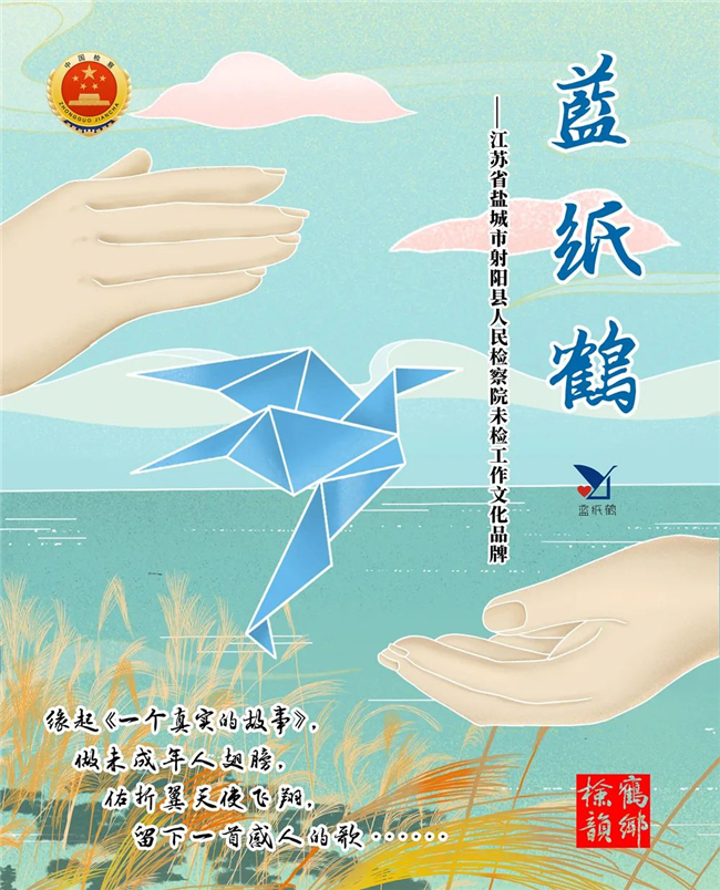 品牌内涵:“蓝纸鹤”代表的是未成年人检察产品的优秀品质。“蓝”是海天蓝、检察蓝,象征检察人的包容和担当;“鹤”是丹顶鹤、千纸鹤,传达江苏省射阳县检察院对未成年人司法保护的忠心和祈愿。近年来,射阳县检察院浸染丹顶鹤志趣高远、忠贞纯洁的独特气质,逐步培育出以“无私关爱、精心呵护、开放创新、追求卓越”为核心内涵的“蓝纸鹤”文化品牌,品牌蕴含了未检工作忠实、专业、关爱和极致的价值追求。