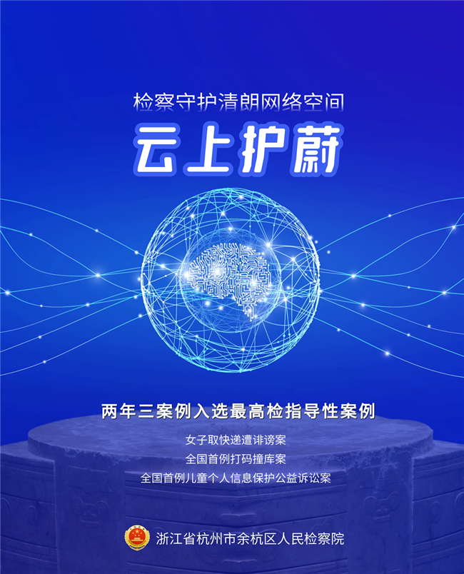 品牌内涵:浙江省杭州市余杭区检察院在浙江检察机关中率先设立互联网检察部,打造互联网检察专业队伍。他们以守护蔚蓝网络空间为目标,严厉打击网络犯罪,深入参与网络社会治理,形成了人人具有互联网检察思维、人人参与检察大数据战略的浓厚互联网检察文化氛围,办理的“全国首例打码撞库案”“女子取快递遭诽谤案”“全国首例儿童个人信息权益保护公益诉讼案”入选最高检指导性案例,生动展示了新时代余杭互联网检察的新样板、新成效。