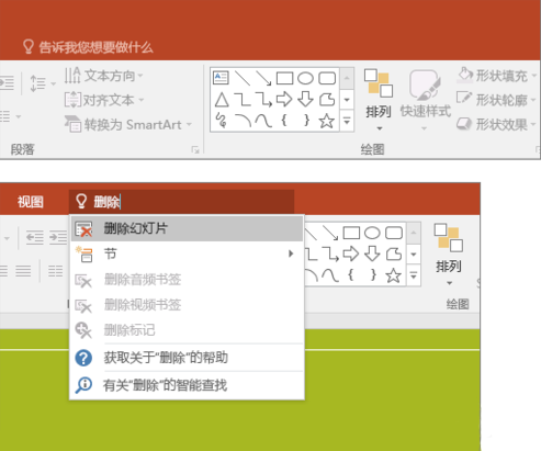 ④使用“操作说明搜索”框。你会注意到在 PowerPoint 2016 功能区上有一个搜索框“告诉我您想要做什么”,这是一个文本字段,可以在其中输入想要执行的功能或操作,所以已经非常人性化了。