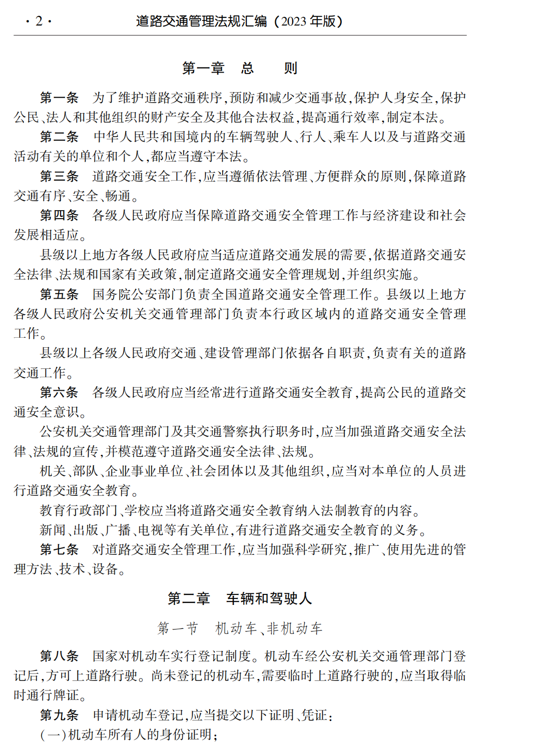 为满足公安交通管理部门执法和管理需要, 方便广大交通 民警全面、 准确学习和使用法律法规, 我们对 2023 年 8 月 1 日以前出台的现行有效的道路交通管理相关法律、 行政法规、 司法解释、 部门规章及国务院、 相关部门和公安部交通管理局下发的规范性文件进行了汇总整理, 编辑了 《道路交通管理 法规汇编 (2023 年版) 》 (以下简称新版法规汇编)。 为便于检索、 查阅, 新版法规汇编按照公安交通管理业务 工作归类方式做了章节编排, 包括总类、 车辆管理、 机动车驾 驶人管理、 交通秩序管理、 道路执勤执法、 道路交通应急管理、 交通事故处理、 队伍建设与执法监督、 交通管理科技与信息化建设、 相关法律法规等十个部分, 共收录文件资料 293 件, 约 225 万字。 本书收录的文件的发文机构名称以文件发布时的机构名称为准, 特此说明。 愿新版法规汇编的出版, 为加强和改进公安交通管理工 作, 进一步推进交警系统执法规范化建设发挥更加重要的作用。 新版法规汇编如有遗漏和不当之处, 欢迎广大读者批评指正。