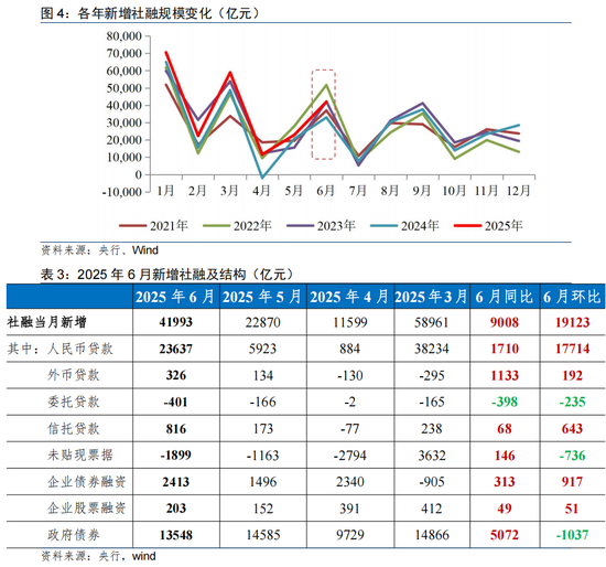 6月新增社融4.20万亿元,同比多增9008亿元,社融增速8.9%,环比提升0.2个百分点、比上年同期高0.8个百分点,主要受到表内信贷和政府债的拉动。
