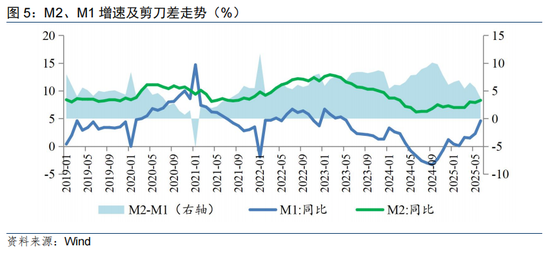 M1增速显著上修,延续5月以来的上行态势。一是化债进程持续推进,财政资金拨付落地和使用对相关企业活期存款形成一定支撑。1-6月置换隐性债务的再融资专项债发行近1.8万亿元,接近全年额度的90%,地方城投等相关企业账面资金情况不断修复。二是季末理财等表外产品资金季节性回流驰援存款,表现为非银存款与一般存款间跷跷板效应。三是去年二季度企业活期受整顿存款“手工补息”影响较大,低基数效应下,6月M1增速延续回升。