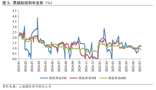 从票据利率看,6月转贴现利率呈“先下后上、月末翘尾”走势。1M期报价全月基本在1%下方运行,报价下限自月初0.97%下探至0.5%低点,下旬逐步上行,月末反弹至1%以上点位。6月1M、3M、6M期转贴现中枢分别为0.81%、1%、1.06%,较5月分别下行38、11、3bp。中上旬一级市场票源供给有限,而部分机构已在收票填补信贷规模,供需错配对票据利率形成一定压制;下旬票源供给量回升,机构对票据的需求减弱,带动转贴现利率转而上行,月末走出翘尾行情。总体看,今年以来金融机构逐步减少低息的票据等资产,更加注重量价均衡。