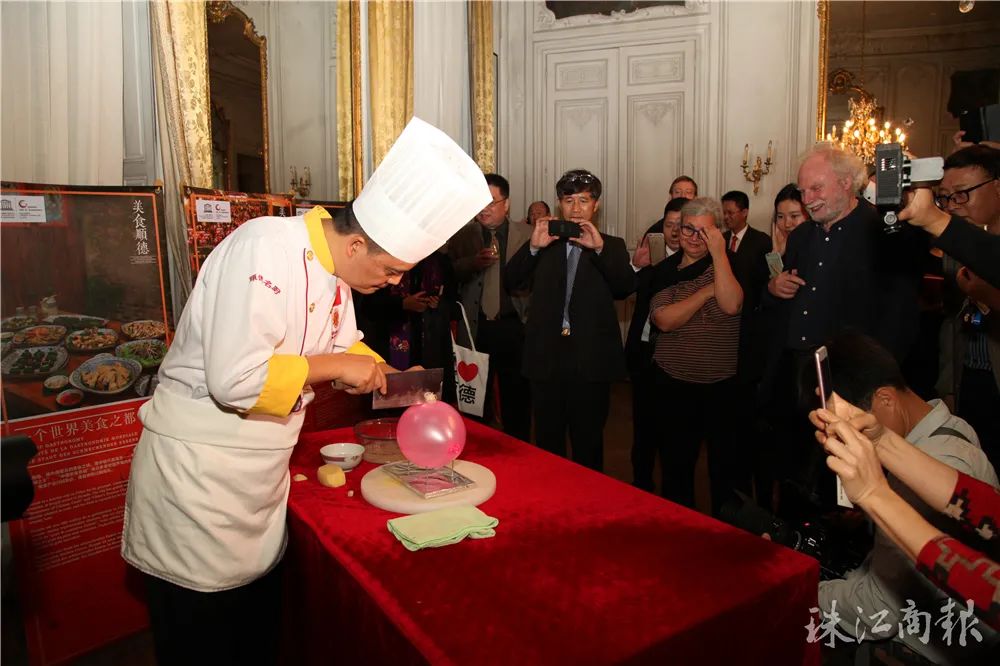▼2015年,在巴黎中国文化中心,顺德名厨林潮带展示刀上“真功夫”,在气球上切可穿过针眼的土豆丝,技惊四座。