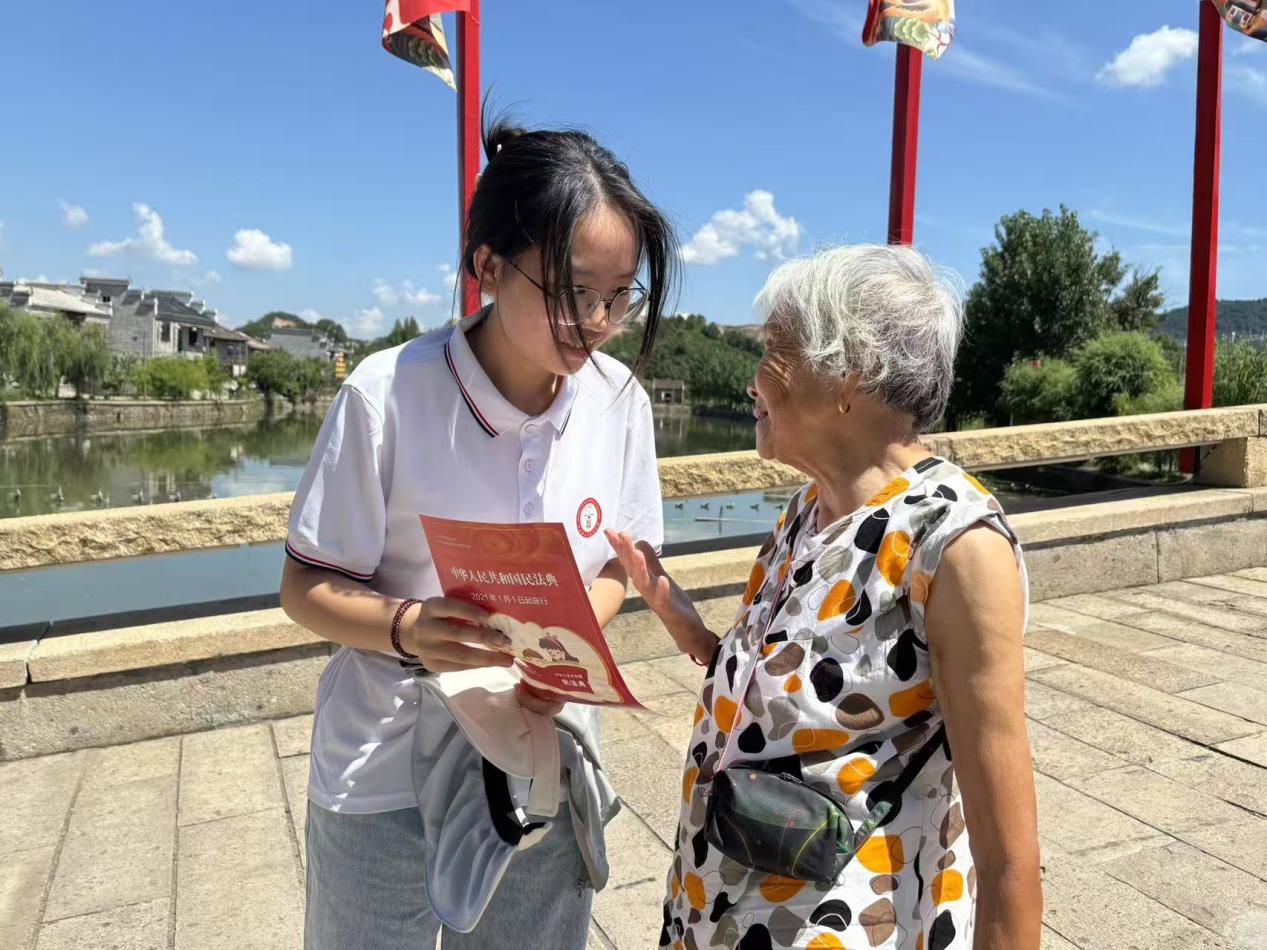 7月2日,实践队抵达被誉为“千年第一古村”的明清建筑群——流坑古村。队员们顶着炎炎烈日,手持精心制作的《民法典》普法宣传资料,走街串巷,深入农户家中开展“送法上门”活动。他们用通俗易懂的语言,结合当地村民关心的热点问题,耐心细致地讲解《民法典》相关条款,解答村民法律疑惑,将抽象的法条转化为贴近生活的“乡土语言”,斑驳的墙垣与普法传单上的法治金句交相辉映,法治的种子在古村落中悄然播撒。