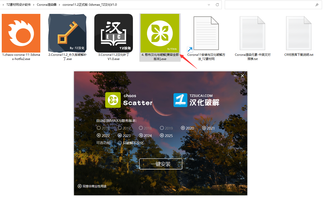 如果您不需要散布;无需安装下方散布的破解与汉化;如果需要,可双击“4. 散布汉化与破解[兼容全部版本].exe”并点击“一键安装”