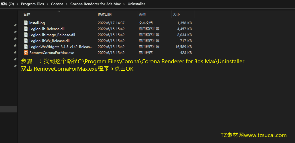 步骤一:找到路径 C:\Program Files\Corona\Corona Renderer for 3ds Max\Uninstaller 双击RemoveCoronaForMax.exe程序>OK>OK