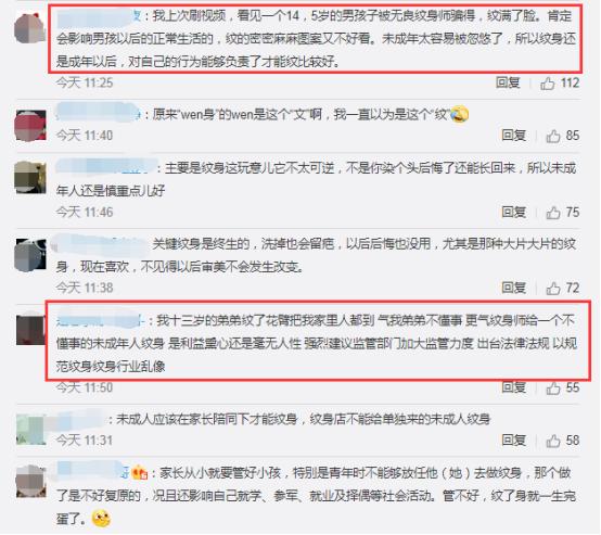 有网友反映,他13岁的弟弟纹了大花臂,家里人对文身师利欲熏心特别生气,希望监管部门加大监管力度,出台法律法规,规范文身行业乱像。