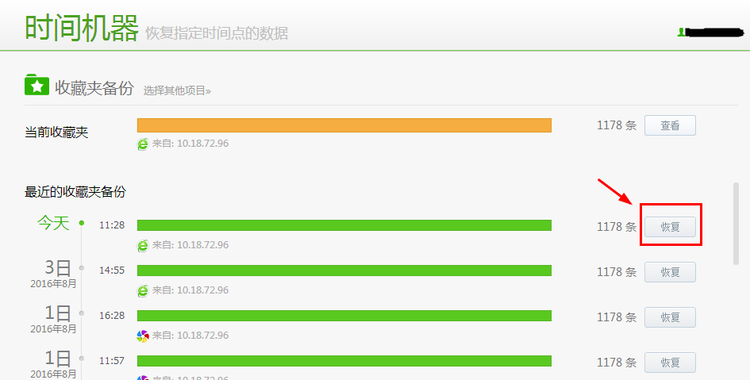 2、选择一个更早的时间,点“恢复”,收藏夹数据就已经恢复到以前一个历史版本了。如果还是不行,可以选择更早时间,点恢复试试