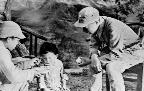 照片的远景,山峦起伏;近景里,年轻军人端着盘子,在给小女孩儿喂饭;年长一些的军人俯下身,慈爱地看着。很难想象,残酷的战争中,偶尔会闪现这样温情的瞬间。估计你也会好奇,怎样的机缘巧合让军人和孩子在炮火中相遇?他们之间的这段故事,结局又如何?