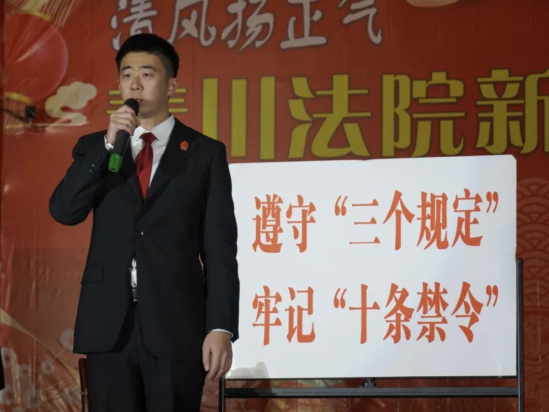 图为竹园人民法庭负责人在新春文艺表演中将法院办理的一件执行案件改编成小品的一幕,照片中的展板“遵守‘三个规定’,牢记‘十条禁令’”醒目,体现法院人在日常工作中坚守纪律规矩,以铁律筑牢公正司法防线,弘扬清风正气的日常,也突出青川县人民法院正在大力开展的“法庭自审自执”工作和廉洁自律、拒腐防变的紧密联系。