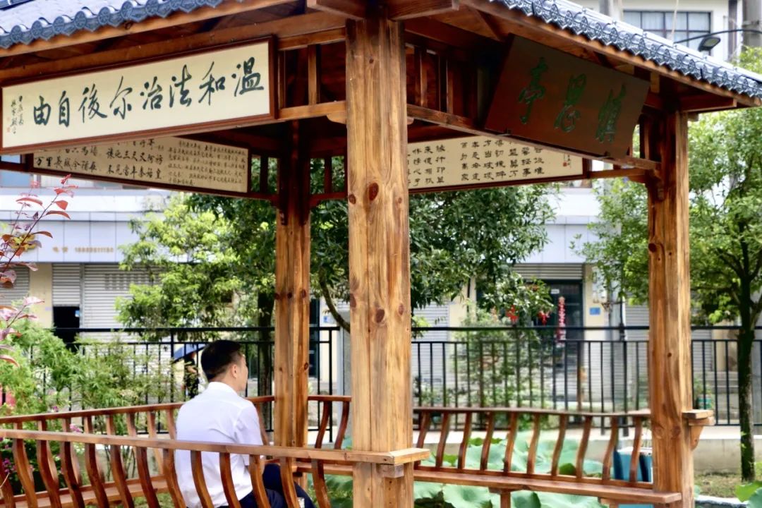 图中,“慎思亭”古朴伫立,亭上“温和法治尔后自由”等文字蕴含深意,提醒人们深思自省。此亭可作为法官在进入法庭前廉洁自省之所,告诫干警在工作生活中要审慎思考、规范言行,秉持廉洁自律准则,面对错综复杂的案子时,亦要慎思慎行,公正司法,寻得法理感温情。