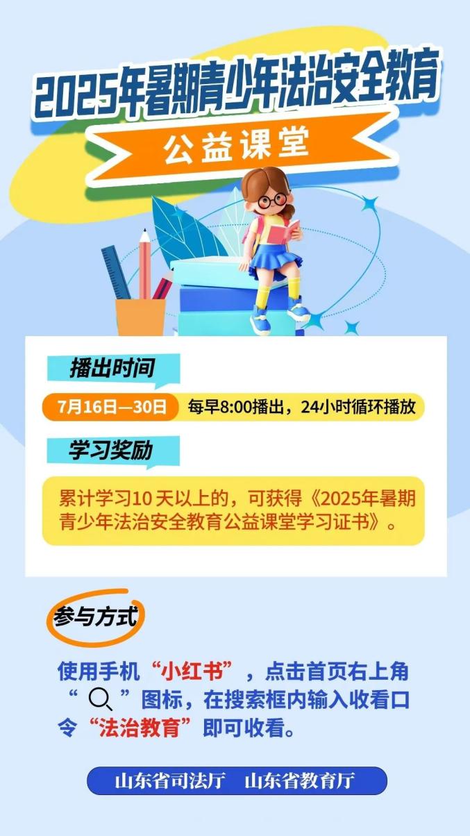 为深入推动全省“八五”普法规划实施,着力推进校园法治文化建设,切实加强暑期青少年法治安全教育,山东省司法厅、省教育厅依托中国教育网络电视台,面向全省大中小学学生及家长,组织开展2025年暑期青少年法治安全教育公益课展播活动。