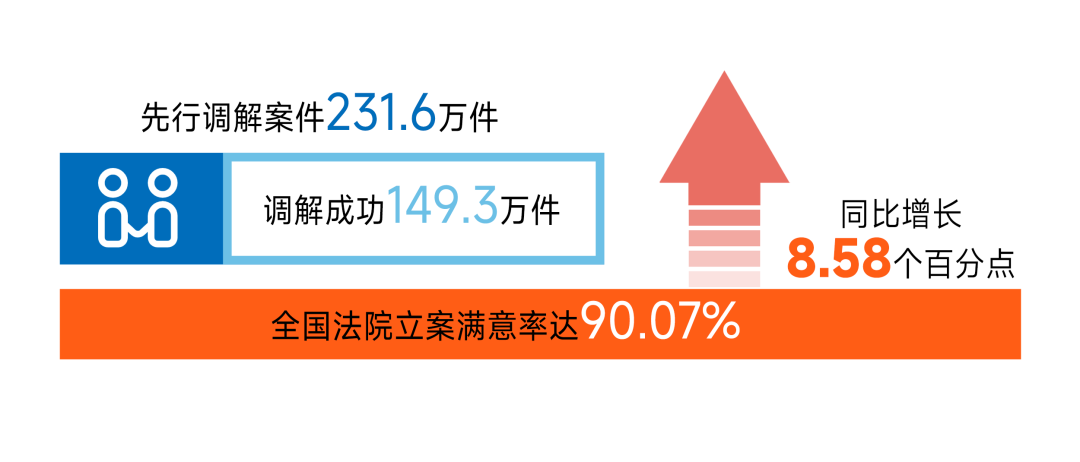 立案和先行调解情况。人民法院坚持把非诉讼纠纷解决机制挺在前面,全力参与社会治安综合治理中心规范化建设,有机衔接登记立案、委托调解、依法审理,持续深化完善诉调对接工作机制,有效发挥多元解纷机制作用。先行调解案件231.6万件,调解成功149.3万件,先行调解成功数量逐月明显增长,第二季度先行调解成功107.2万件,环比增长176.1%,前端解纷活力和效能持续释放。截至6月底,2883家基层法院派出诉讼服务团队入驻综治中心,促推纠纷化解从“多头跑”向“一站解”转变。指导“总对总”合作单位调解纠纷40万件,其中依托人民法院调解平台,“总对总”合作单位自行调解27.2万件,同比增长10.3倍,“总对总”多元解纷机制持续深化。起诉状、答辩状示范文本应用贯穿纠纷化解全流程,更有利于当事人准确、全面表达诉求,促推调解和案件审理质效进一步提升,72%的当事人、律师主动应用要素式示范文本开展诉讼,较第一季度增长21个百分点,金融借款合同、信用卡、保证保险合同等纠纷起诉状示范文本应用率超80%,当事人应用体验感持续提升,全国法院立案满意率达90.07%,同比增长8.58个百分点。