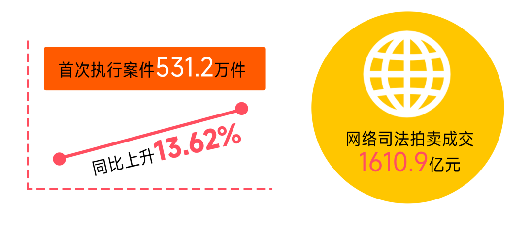 执行案件办理情况。人民法院不断深化执行机制改革,促推“切实解决执行难”,积极推动将胜诉当事人“纸上权益”兑现为“真金白银”,积极服务法治社会、诚信社会建设。受理首次执行案件531.2万件,同比上升13.62%。执行完毕率和执行到位率分别为41.96%和54.38%,保持高位运行。新纳入失信名单103.3万人次,同比下降2.46%,连续五个季度下降;111.58万人次通过信用修复回归市场,信用修复工作的科学管理水平稳步提升。网络司法拍卖成交1610.9亿元,上拍量、成交量、成交率同比上升,财产处置工作成效持续提升。