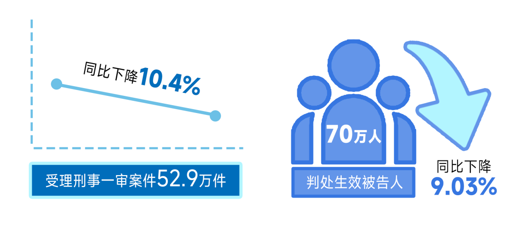 刑事案件审判情况。人民法院全面贯彻总体国家安全观,准确贯彻宽严相济刑事政策,依法惩治各类犯罪,以严格公正司法维护国家安全和社会稳定。受理刑事一审案件52.9万件,同比下降10.4%。判处生效被告人70万人,同比下降9.03%。依法严惩严重刑事犯罪,判处五年有期徒刑以上刑罚的罪犯5.1万人,同比下降4.65%。受理破坏社会主义市场经济秩序罪一审案件3.5万件,同比上升2.65%。最高人民法院发布5件促进民营经济发展典型刑事案例,加强对非法经营、合同诈骗、强迫交易、民营企业内部腐败犯罪等案件的监督指导,依法平等保护民营企业合法权益。受理串通投标罪一审案件707件,同比上升30.44%。针对串通投标犯罪大幅上升态势,最高人民法院联合国家发展和改革委员会发布6件典型案例,涵盖工程建设、物资采购、土地承包等多个经济领域,发挥典型案例教育警示震慑作用。受理危险驾驶罪一审案件12.1万件,同比下降14.96%。危险驾驶刑事案件数量降幅明显,但仍居刑事案件第一位。人民法院深入贯彻落实《关于办理醉酒危险驾驶刑事案件的意见》,规范案件办理,统一裁判尺度,实现对醉驾犯罪的精准打击、惩防并重。
