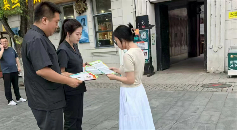 法官在街区内的主要广场、商业街等游客密集区域设置法治宣传展板,通过图文并茂的形式解读旅游法、消费者权益保护法等法律法规,并精选“不合理低价游”“虚假宣传”等典型案例进行警示。法官还向游客与商户发放定制的“公法伴游”宣传手册、12348热线联系卡及服务二维码,手册涵盖合同纠纷处理、消费维权途径等实用法律知识,让群众轻松获取“一站式”法律指引。