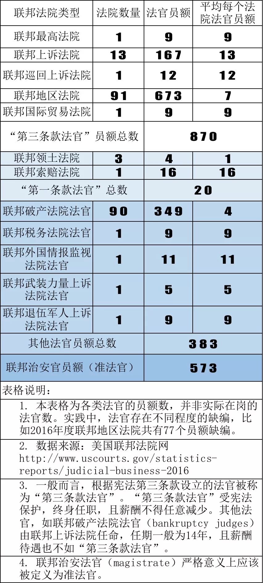 总的来说,2016年度美国联邦狭义法官员额约为1273名(不含治安法官)、广义的法官员额则为1846名。