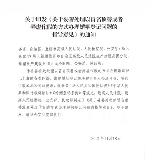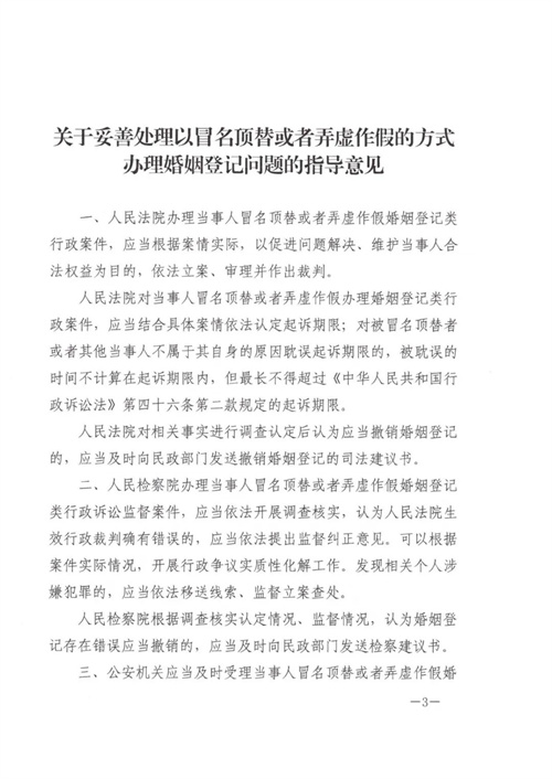 为畅通解决冒名婚姻登记纠纷法律救济渠道,凝聚司法机关和行政机关合力,依法及时维护当事人的合法权益,最高检会同最高法、公安部、民政部共同制定了《关于妥善处理以冒名顶替或者弄虚作假的方式办理婚姻登记问题的指导意见》,为妥善有效处理此类问题提供了制度保障。