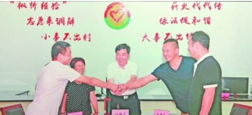 发扬新时代“枫桥经验”,运用法治思维和法治方式化解矛盾纠纷。图为在浙江省诸暨市枫桥镇调解志愿者联合会的调解下,当事人握手言和。