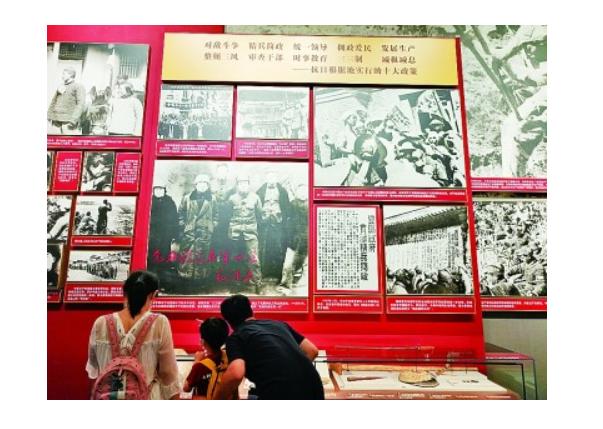 延安时期,党在领导边区法治建设的过程中,进行了历史性探索。《陕甘宁边区施政纲领》成为抗战时期边区的根本大法。“黄克功案件”的审判,彰显了从严治党、从严治军的决心。“马锡五审判方式”的确立,为新民主主义司法制度注入了新鲜血液,也为新中国司法制度的建立提供了有益经验。图为观众在参观抗日根据地建设有关情况。