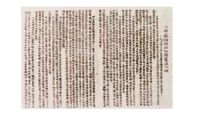 《中华苏维埃共和国宪法大纲》是第一部由劳动人民制定的根本法,是共产党领导人民反帝反封建的伟大纲领,为以后制定民主宪法提供了宝贵经验。图为展览中的《中华苏维埃共和国宪法大纲》文本。