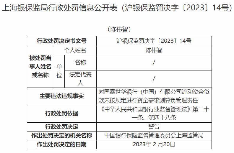 同日公布的上海银保监局行政处罚信息公开表(沪银保监罚决字〔2023〕14号)显示,陈伟智对国泰世华银行(中国)有限公司流动资金贷款未按规定进行资金需求测算负管理责任,上海银保监局依据《中华人民共和国银行业监督管理法》第二十一条、第四十八条,对陈伟智警告。