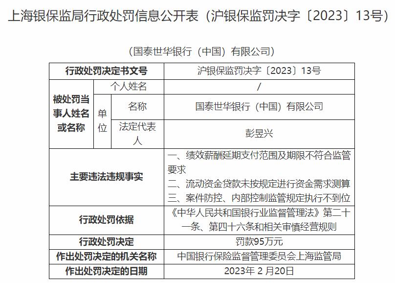 中国经济网北京2月28日讯 银保监会网站昨日公布的上海银保监局行政处罚信息公开表(沪银保监罚决字〔2023〕13号)显示,国泰世华银行(中国)有限公司绩效薪酬延期支付范围及期限不符合监管要求;流动资金贷款未按规定进行资金需求测算;案件防控、内部控制监管规定执行不到位。上海银保监局依据《中华人民共和国银行业监督管理法》第二十一条、第四十六条和相关审慎经营规则,对其罚款95万元。