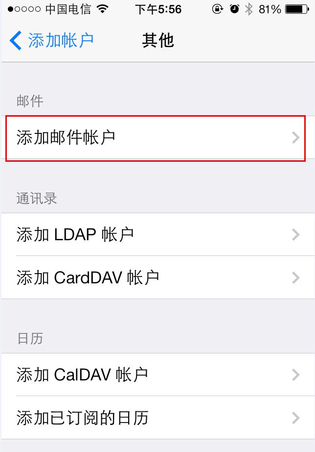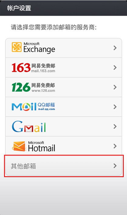 2、选择邮箱类型选择"添加账户"后, Iphone邮箱有默认的几款邮箱设置,让您选择您的邮箱类型。新浪免费、Vip邮箱不在列表中,所以请选择"其他"