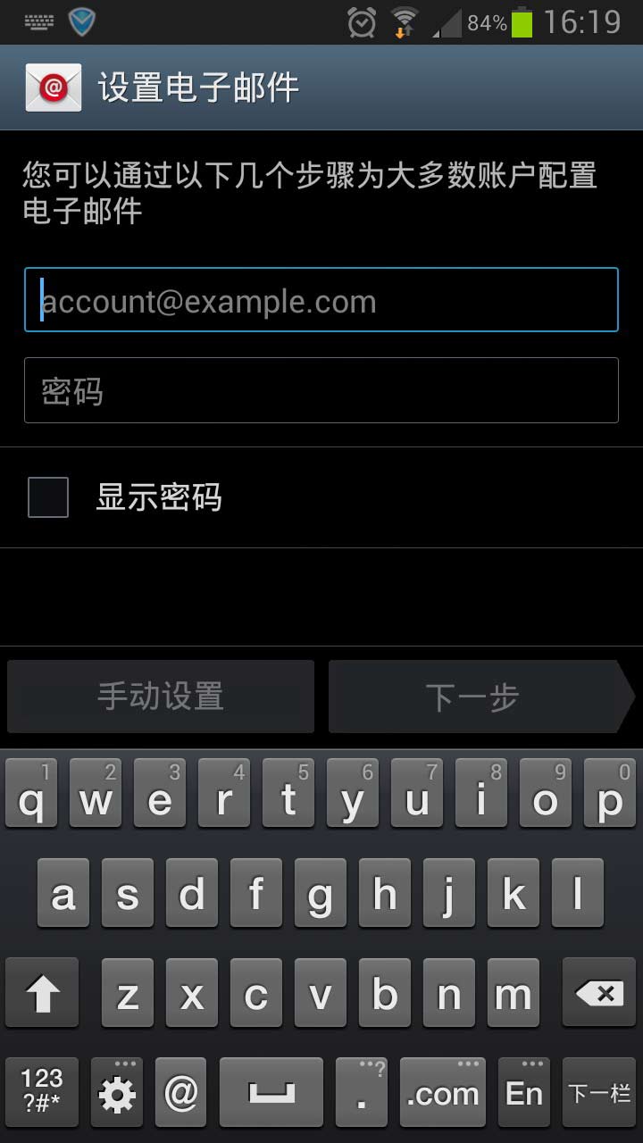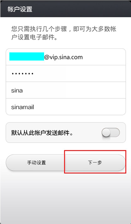 如何在Android上设置新浪邮箱 第一步:点击"新建账户",填写邮件地址和密码后点击"手动设置"