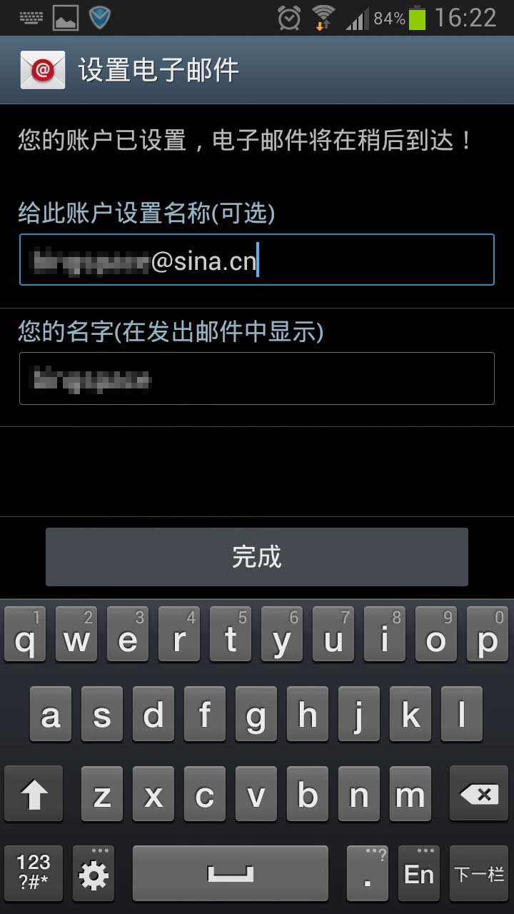 在手机中打开自带的"电子邮件"应用,填写新浪邮箱地址及密码,服务器地址分别为: