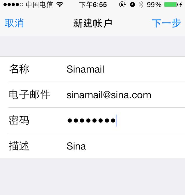 在手机中打开自带的的"电子邮件"应用,填写新浪邮箱地址及密码,服务器地址分别为:
