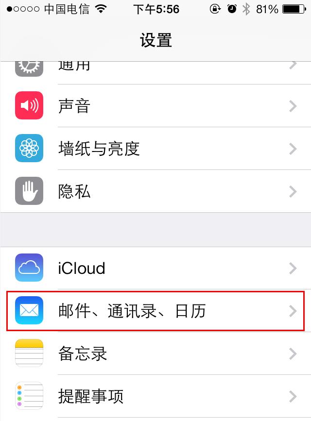 1、进入设置首先进入iphone的"设置",选择"邮件、通讯录、日历"一项