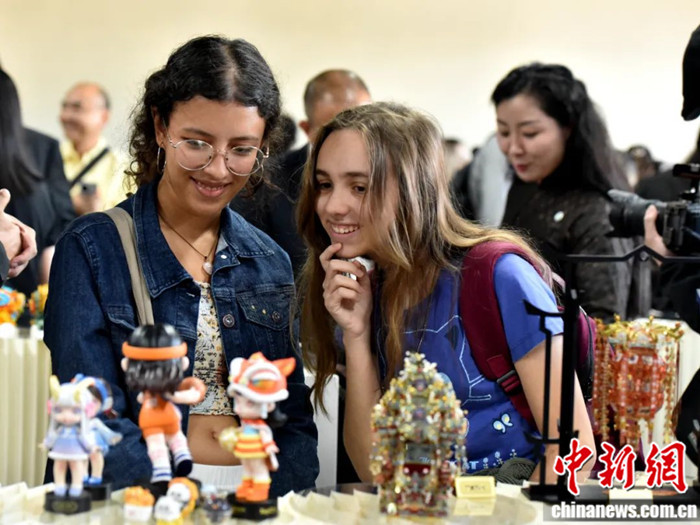当地时间2025年6月27日,文明的对话系列活动(金砖专场)在巴西里约热内卢州立大学举行。两位巴西女大学生在配套举行的“欢朋满粤”岭南文化创新展上,被篮球城市东莞的少女形象潮玩迷住了。 中新社记者 林春茵 摄