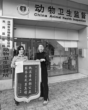 图二:消费者向龙岗市监局赠送锦旗,感谢高效调处宠物医院消费退费纠纷。