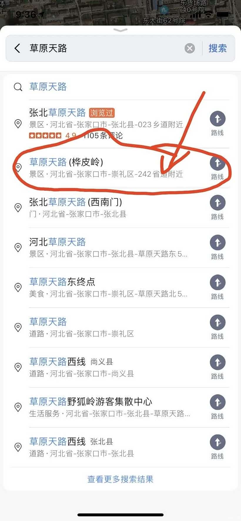 打开高德地图APP,然后直接搜索“ 草原天路 ”,如下图所示,会出现一堆提示栏,野狐岭进天路,请选择“ 张北 草原天路 023乡道附近”, 我已经在图片里把这个地方画了红圈,请仔细看。这个地方就是 草原天路 正大门,准确无误。也就是人们常说西入口