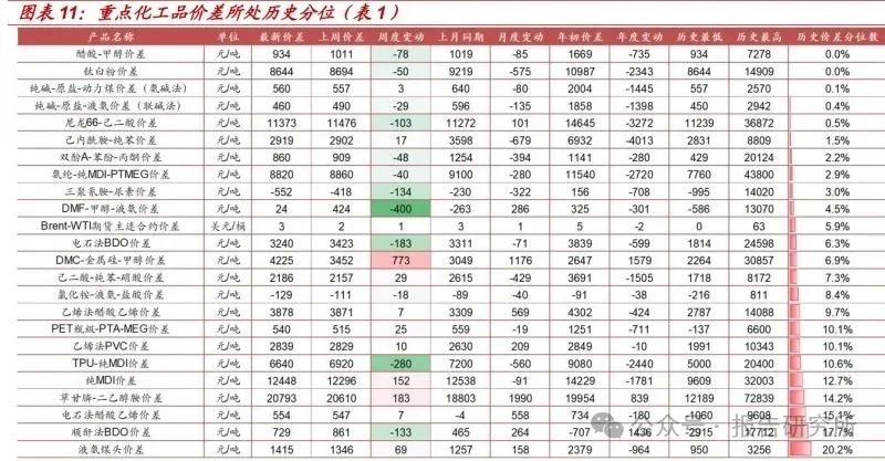 行业格局好叠加需求旺季催化,MDI 具备涨价潜力。一方面,考虑到TDI价格受近期行业供给收窄影响持续上涨,MDI 或通过改性等方式实现一部分替代 TDI 需求,价格存跟涨潜力;另一方面,产品本身需求望迎金九银十传统旺季,价格同步存向上潜力。根据Wind,截至7 月28日,国内纯MDI 和聚合 MDI 价格分别为 17050 和 15550 元/吨,较2025年年初-1600和-2650 元/吨,位于 2009 年以来的 17.7%和18.4%分位。价差上看,截至7 月 28 日,国内纯 MDI 和聚合 MDI 价差分别为12016 和10516元/吨,较2025 年年初分别-717 和-1767 元/吨,位于2009 年以来的10.2%和15.3%分位。