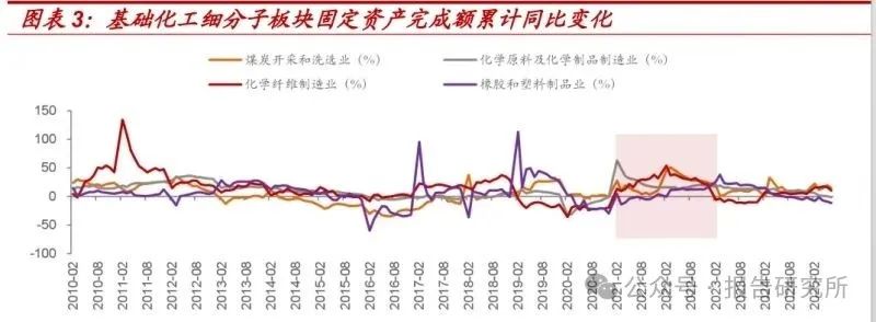 2021-2022 年基础化工子行业固定资产完成额快速增长,近期有所放缓。受 2021-2022 年的行业高盈利趋势,基础化工各细分板块固定资产完成额累计同比表现均出现不同程度的提升,基本呈现双位数快速增长。从近期表现上看,截至 2025 年 6 月,煤炭开采和洗选业、化学原料及化学制品、化学纤维制造业、橡胶和塑料制品业固定资产投资完成额累计同比增速分别为14.4%、-1.1%、10.6%、-11.1%,月环比-5.5pct、-1.5pct、-5.8pct、-2.3pct,年同比-2.2pct、-9.5pct、+4.2pct、-1.2pct,反映多数行业扩产已基本趋于尾声。