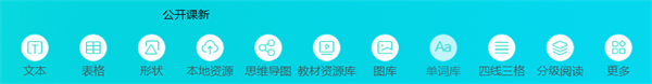 双击某个课件进入课堂宝备课界面之后,可以看到顶部的功能菜单栏中有教材资源库、图库、单词库、文本、四线三格、形状、表格、本地资源、分级阅读、思维导图等等,点击最右侧的“更多"可以添加更多菜单功能。